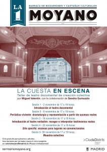 El taller explorará vías de teatro documental para generar material y organizarlo de manera que nos sirva para contar lugares y experiencias reales. Técnicas como el teatro verbatim, el periódico viviente o el site specific nos servirán para documentar espacios y situaciones reales en el marco de la cuesta de Moyano.