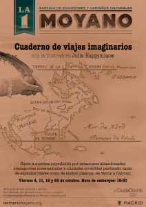 La ilustradora Julia Happymiaow dirige el ciclo de talleres Cuaderno de viajes imaginarios, cuatro sesiones los cuatro viernes del mes a partir de las 18:30 donde las alumnas y alumnos dibujarán a partir de travesías soñadas desde lugares reales o desde lugares imaginados por autores como Italo Calvino o Julio Verne.