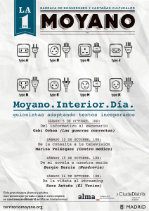 Octubre también abrirá las puertas de la 1 de Moyano a los guionistas de teatro, cine y televisión, que explicarán cómo es el arduo proceso de adaptar una realidad a otra muy diferente: casos médicos, entrevistas, novelas, cómics. Todo materiales susceptibles de ser vistos en el escenario o en la pantalla. Los ponentes serán de la talla de Gabi Ochoa (Las guerras correctas), Marina Velázquez (Centro Médico), Sergio Sarria (El intermedio, Nasdrovia) y Sara Antuña (Aida, Los hombres de Paco, El vecino), y estarán todos los sábados del mes a las 18:00, con entrada libre y con la colaboración del Sindicato ALMA de guionistas.